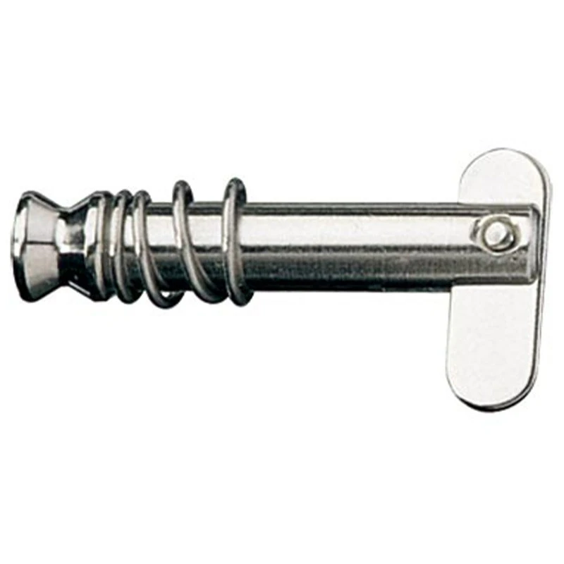 Axe en inox à éjection rapide. L’axe est équipé d’un linguet qui bascule pour sécuriser l’axe une fois celui-ci en place. le ressort opère une pression sur l’axe le maintenant bien en place et empêchant le linguet de se défaire.