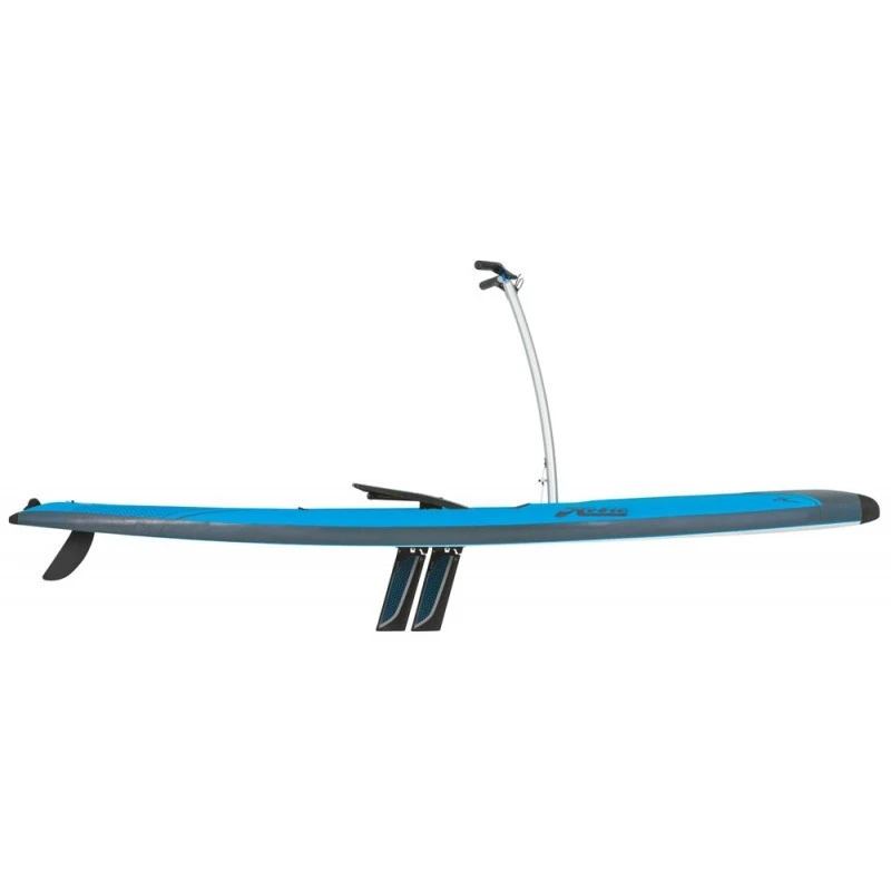Debout sur l’eau, on avance en appuyant sur les pédales du mirage drive, tout en changeant de direction en actionnant les poignées du guidon.