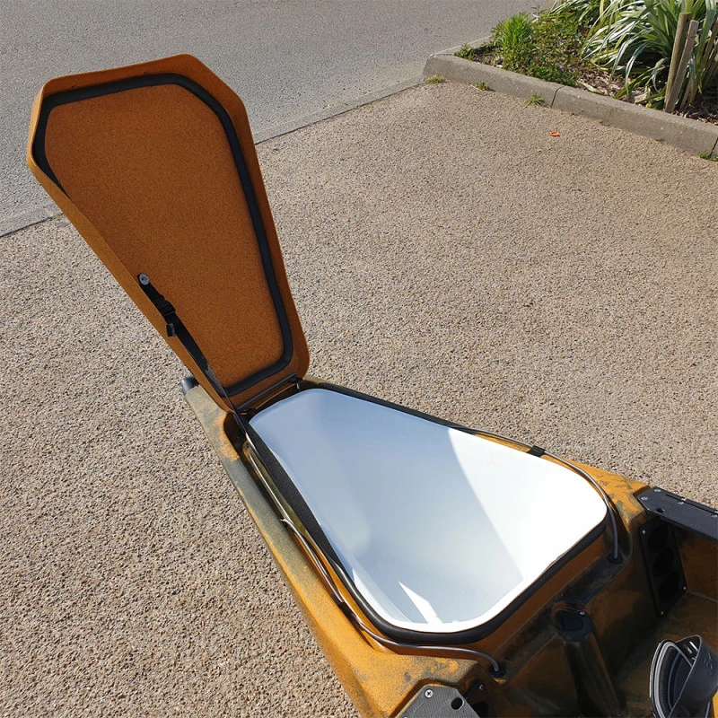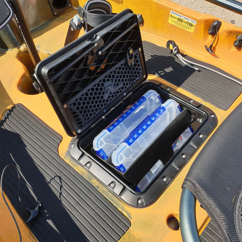 Devant le siège, est positionné une grande trappe rectangulaire donnant directement accès à 2 boites à leurres plano. de chaque coté du siège, des filets mesh vous permettrons de ranger le petit matériel que vous désirez garder à porter de main.