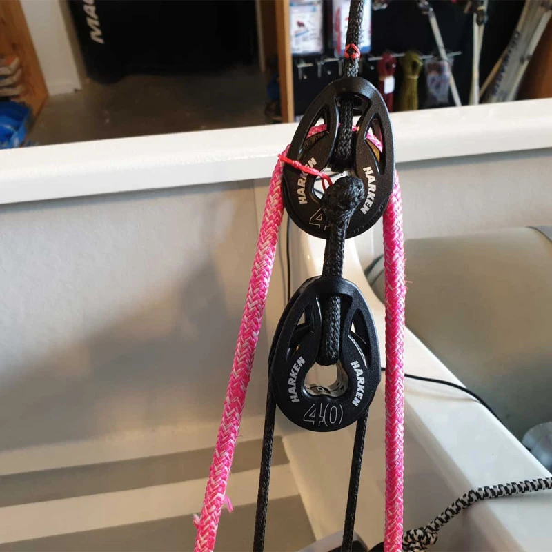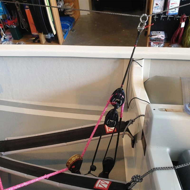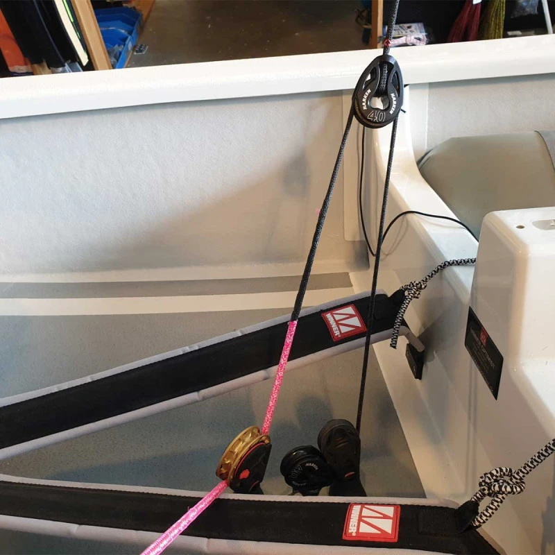 Lorsque les jeunes régatier.es seront plus à l’aise en 3 brins, il suffira juste d’enlever la poulie basse du kit qui est attaché à la poulie haute avec une manille textile.